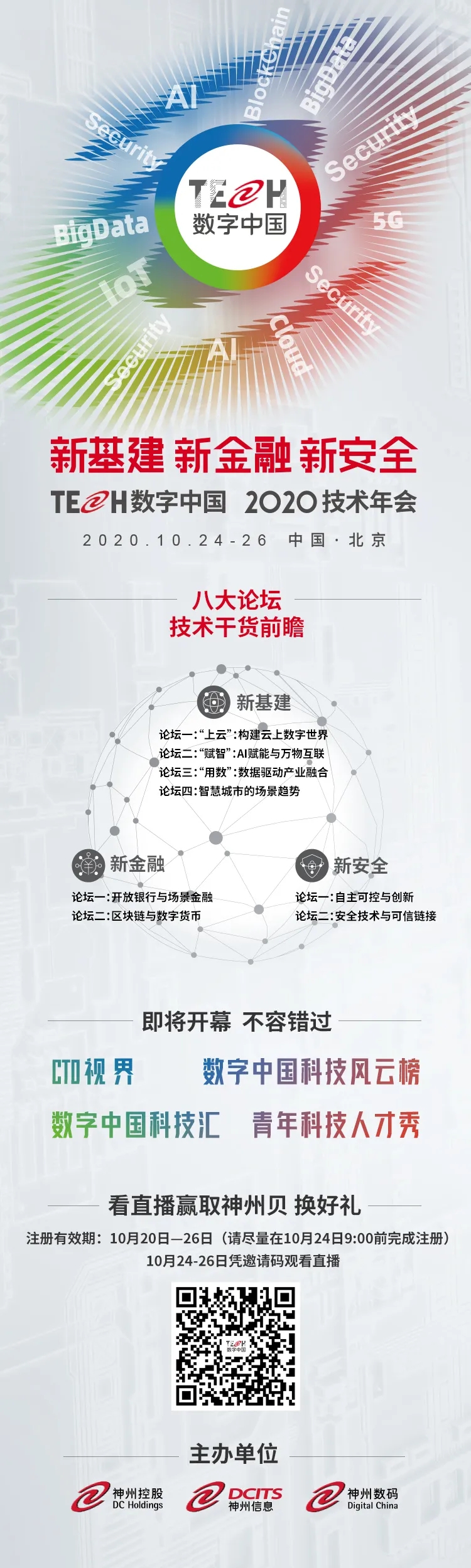 Attention! TECH数字中国 2020技术年会又如期而至啦,本届技术年会围绕“新基建 新金融 新安全”主题,10.24-26日为期三天,以“线上+线下”相结合的形式开展。
