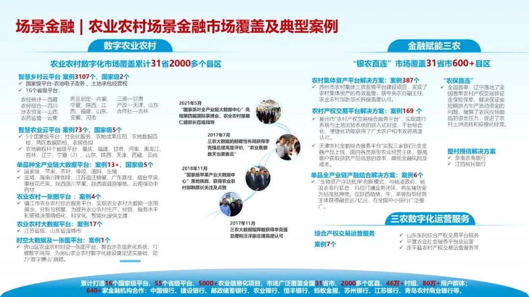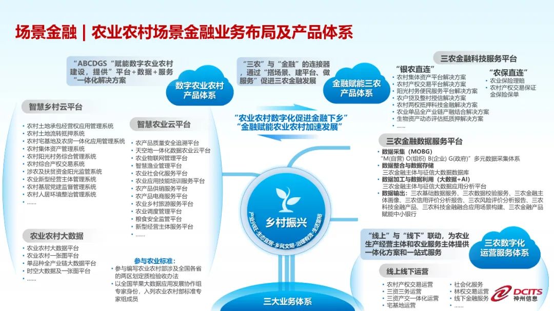神州信息在过去20年推进农业农村信息化走向数字化的过程中发现,乡村振兴的核心是产业兴旺,产业兴旺的关键在资本下乡,而资本下乡的难点是让资本发现产业价值,科技、数据、场景的融合创新是实现三农数据资产化的关键路径。对此,最新发布的2022年一号文在“扩大乡村振兴投入”的任务中提出“强化乡村振兴金融服务”。神州信息作为金融科技企业,发挥懂科技、懂金融、懂数据的复合优势,2018年前瞻探索并落地“科技+数据+场景”金融服务模式,在政策引导、安全合规的前提下,以数据为核心,紧扣三农场景的金融服务需要,与金融机构密切合作,联合创新金融普惠三农的产品及服务体系,已与银行、保险等640余家金融机构合作,有效助力国有大行普惠金融。