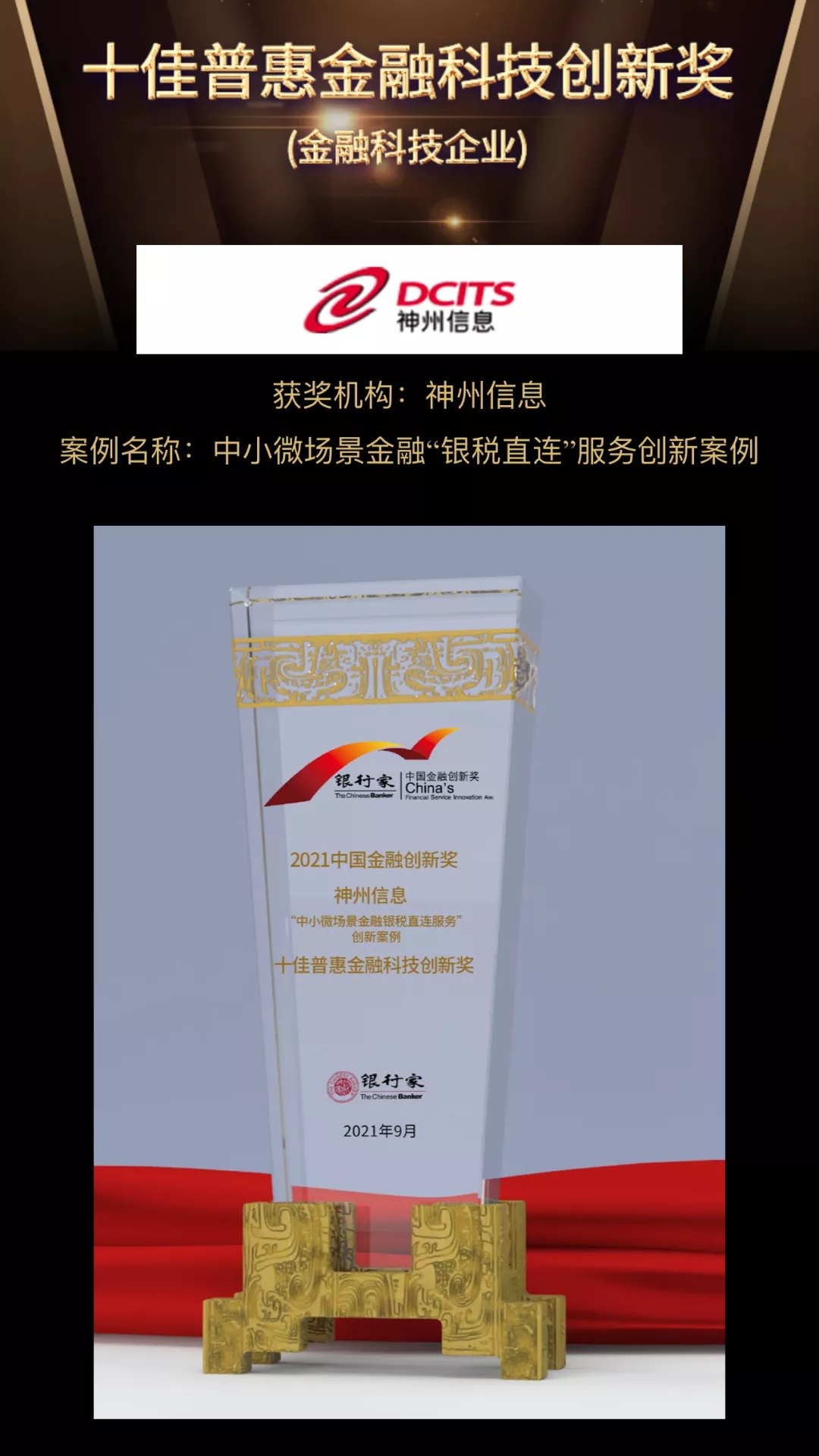 立足建党百年和“十四五”规划的开局之年,近日,由《银行家》杂志主办的“中国金融创新论坛暨2021中国金融创新成果线上发布会”在京召开,旨在表彰中国金融创新力量。神州信息自主研发的金融超脑Sm@rtFSB和 “银税直连”助力金融服务中小微案例分别荣获2021“最佳金融创新奖”和“十佳普惠金融科技创新奖”两项大奖;其中“最佳金融创新奖”仅有四家公司获评。在众多参选案例中脱颖而出,连续摘得行业重量级奖项,神州信息已成为金融科技创新的风向标。